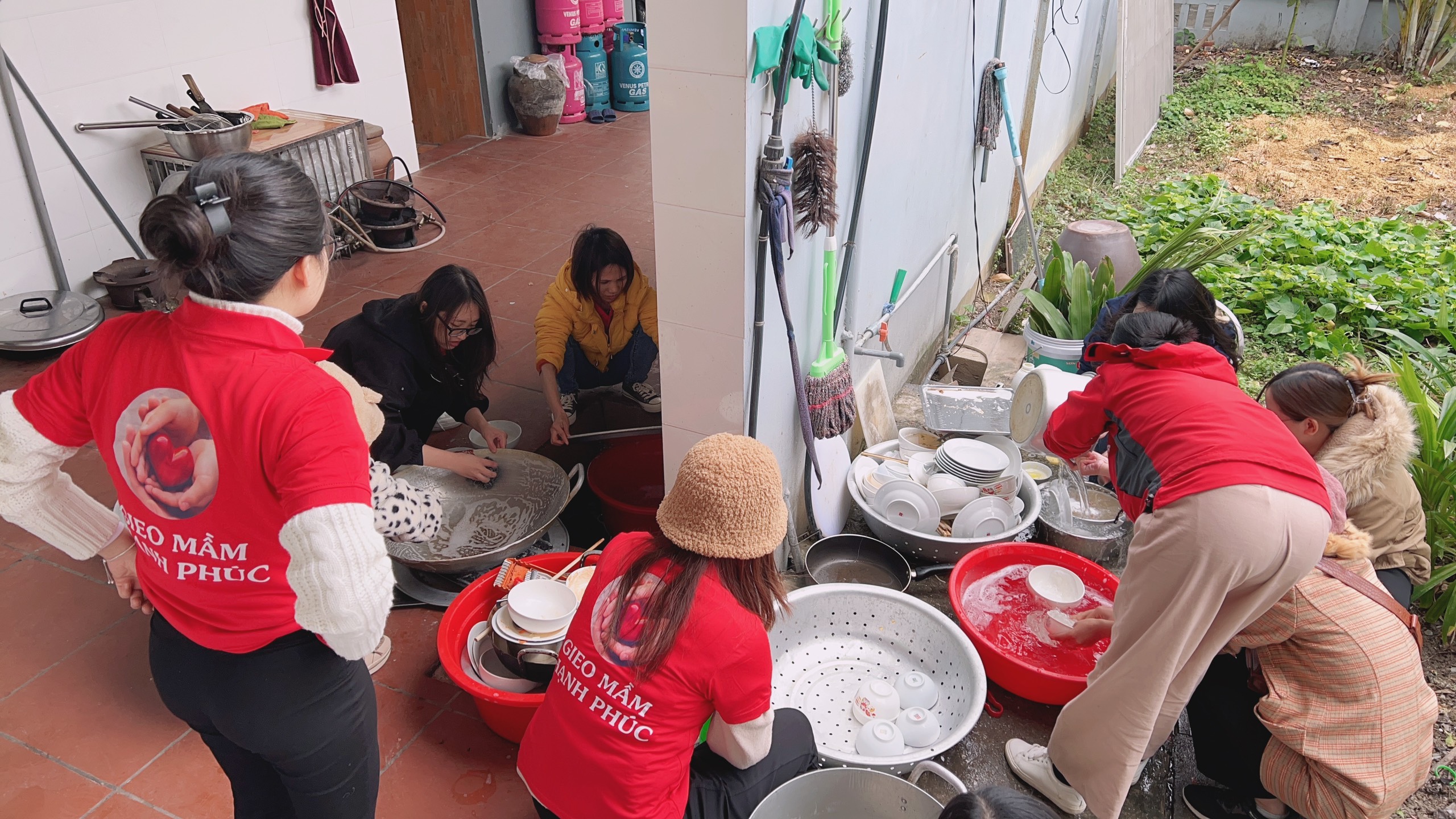 9h sáng, đội ngũ Gieo mầm hạnh phúc có mặt tại nhà tình thương Hương La. Lúc này, tất cả mọi người cùng nhau xắn tay lao “vào bếp”, đích thân nấu cơm trưa cho các sơ và các em nhỏ tại đây. Mỗi một món ăn đều chất chứa đầy sự thương yêu của đội ngũ Gieo mầm hạnh phúc.
