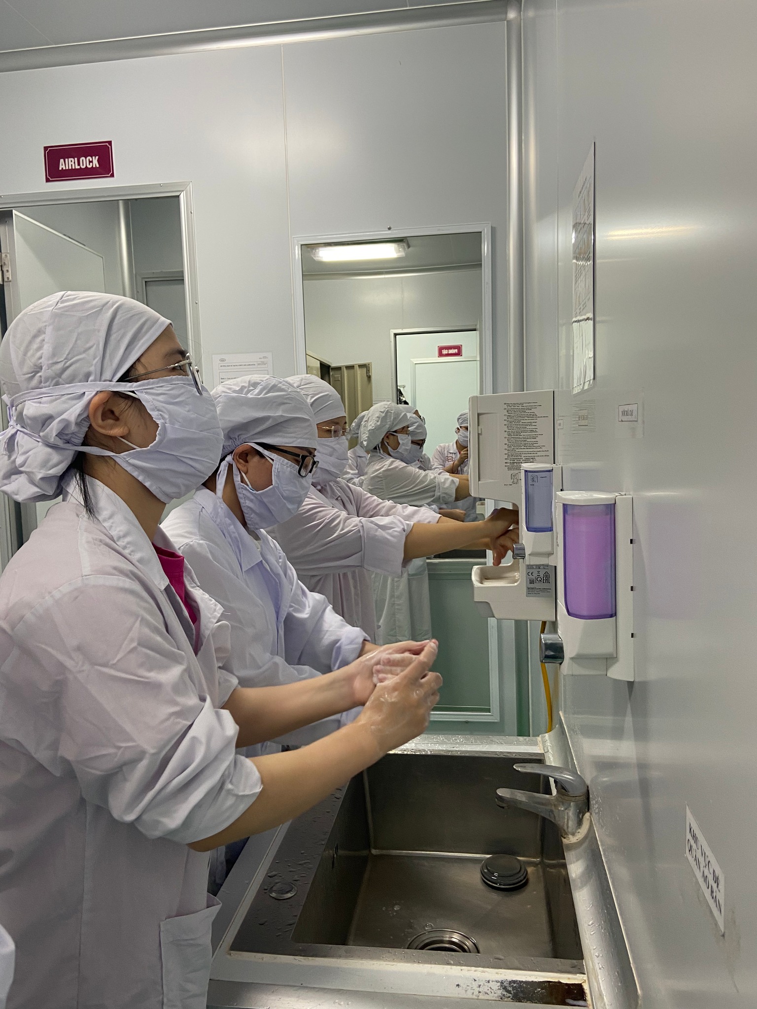Công nhân tại nhà máy khi vào ca sản xuất hay bất cứ ai đến tham quan đều phải thay 2 lần trang phục bảo hộ, rửa tay bằng xà phòng chuyên dụng sát khuẩn theo đúng 6 bước theo tiêu chuẩn của Bộ Y tế và tráng rửa lại tay bằng cồn sạch sẽ. Sau đó phải đeo găng tay kín, mặc áo bảo hộ chuyên dụng dài che kín cơ thể, đeo khẩu trang, đội mũ kín để đảm bảo không được phép để hở 1 sợi tóc ra ngoài, vì yêu cầu sản xuất của nhà máy chuẩn GMP là phải chuẩn sạch và vô trùng, đảm bảo các Thực phẩm bảo vệ sức khỏe sản xuất ra không bị nhiễm khuẩn.